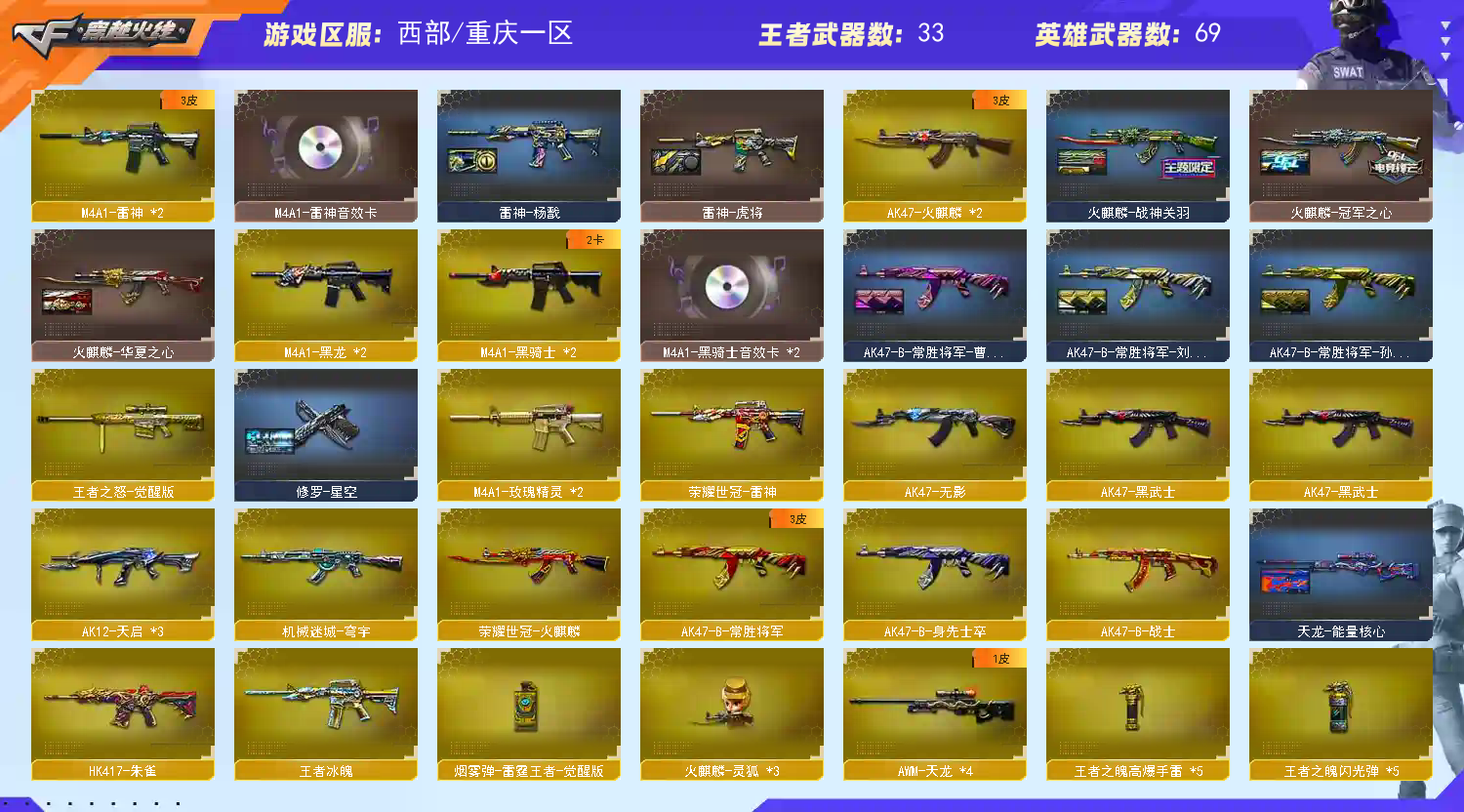 【亮点解析 幻神三件套 裁决三件套 生化满配 】【m200幻神+音效卡+冠军之幻】【6盘龙 炼狱 6烈龙 异变清道夫】【传说暗裔】【scar白虎】【qbz金色蔷薇】【朱雀】【火麒麟+冠军之心 】【黑龙】【雷神+卡】【黑骑士+卡】【毁灭+卡+冠军之怒】【极光+卡】【裁决+卡 +叶芒苍灵】【荣耀世冠套】【武器:王者之魄 王者之势 荣耀世冠火麒麟 荣耀世冠雷神 天龙 】【6手枪:修罗 天神*4 荣耀世冠柯尔特】【15刀具:屠龙*2 龙啸 擎天 麒麟刺 王者之锋*2 王者之啸 王者之击 荣耀世冠龙啸 王者冰锋 】【雷套:】【小人枪:雷神精英刀锋 火麒麟灵狐 】【音效卡:雷神音效卡 幻神音效卡 黑骑士音效卡 毁灭音效卡 裁决音效卡 极光音效卡 黑骑士音效卡 】【四防角色:王者葵貂蝉 王者玲珑小乔 潘多拉-驭雪大PrO】