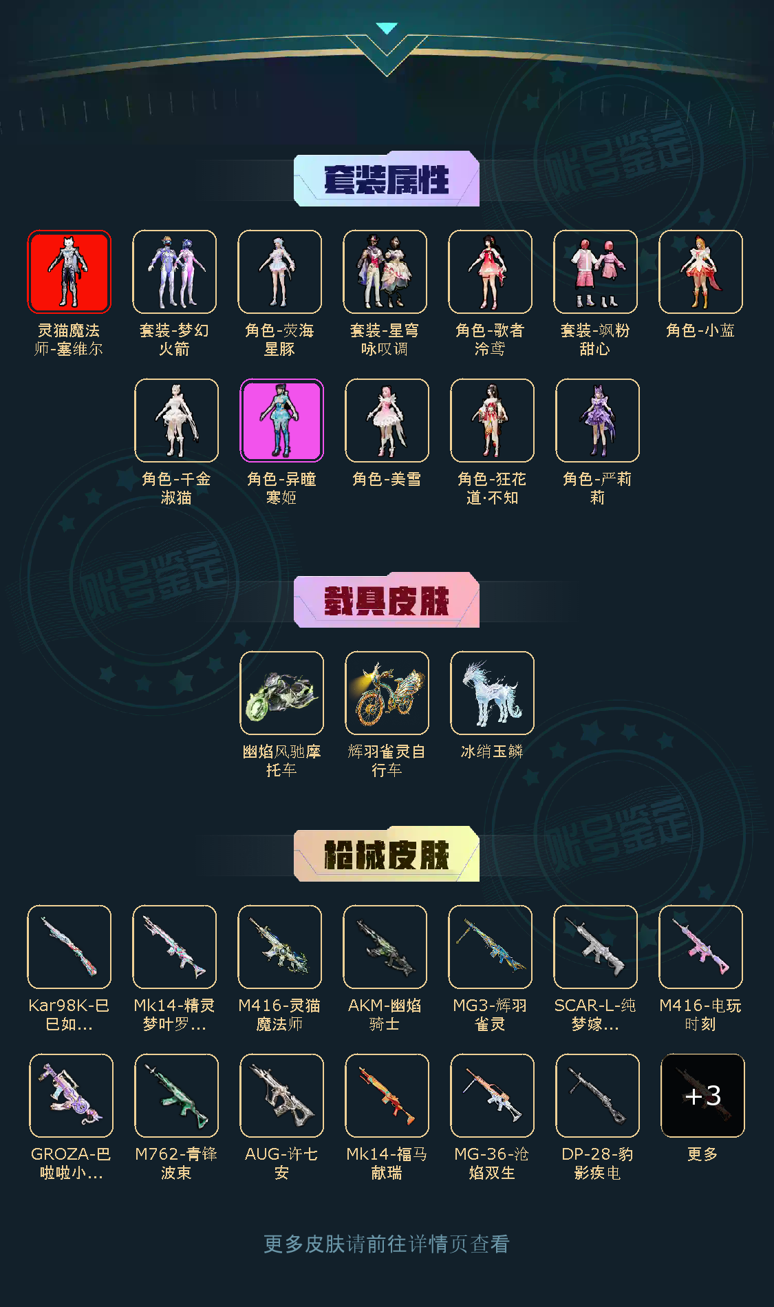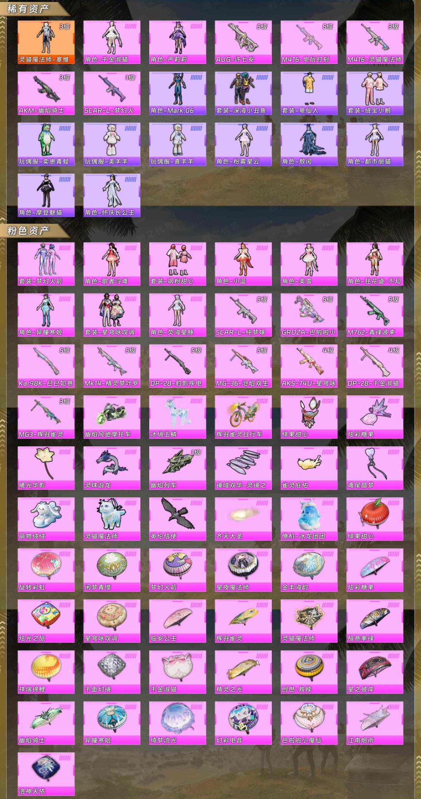 【稀有资产】灵猫魔法师-塞维尔[3级]/角色-千金淑猫/角色-严莉莉/AUG-许七安/M416-电玩时刻/M416-灵猫魔法师/AKM-幽焰骑士/SCAR-L-梦幻火箭/角色-Mark.06/套装-深海小丑鱼/套装-龟仙人/套装-绒宝小鹅/玩偶服-卖崽青蛙/玩偶服-美羊羊/玩偶服-喜羊羊/角色-粉雾星云/角色-敖闰/角色-都市丽猫/角色-摩登魅猫/角色-怀庆长公主