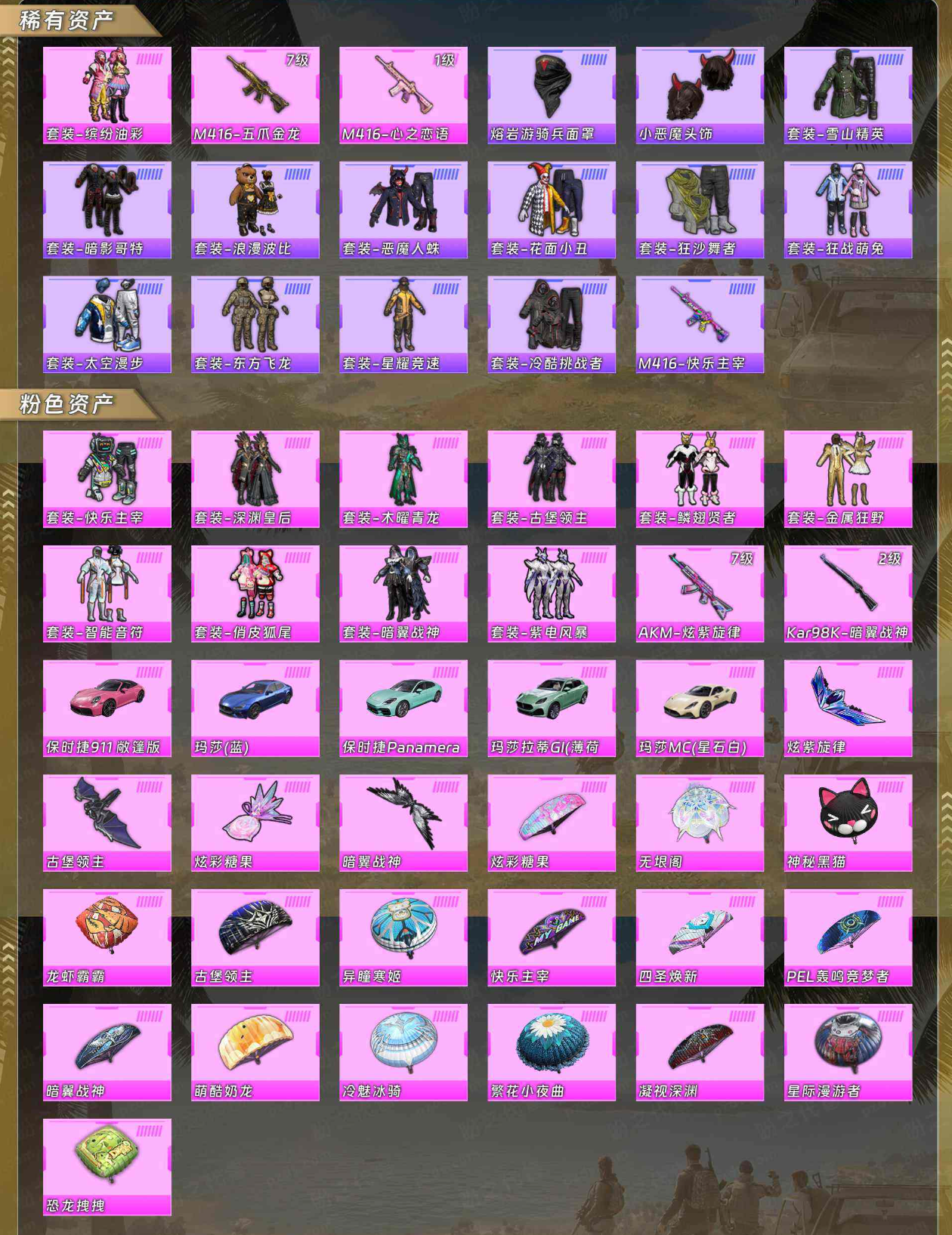 【稀有资产】套装-缤纷油彩/M416-五爪金龙/M416-心之恋语/熔岩游骑兵面罩/小恶魔头饰/套装-雪山精英/套装-暗影哥特/套装-浪漫波比/套装-恶魔人蛛/套装-花面小丑/套装-狂沙舞者/套装-狂战萌兔/套装-太空漫步/套装-东方飞龙/套装-星耀竞速/套装-冷酷挑战者/M416-快乐主宰