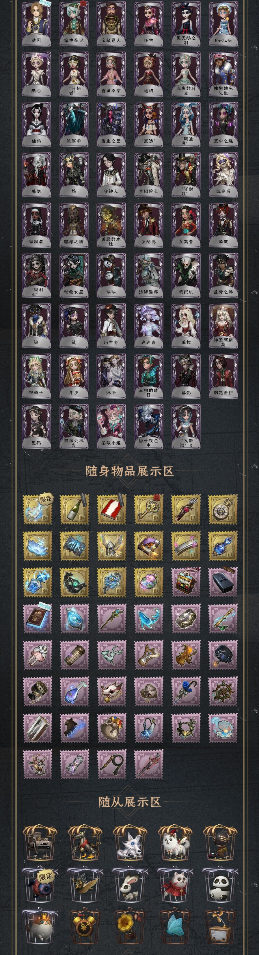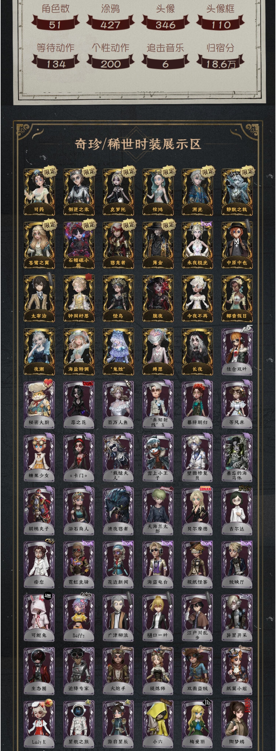 角色数51涂鸦427头像346头像框110等待动作134个性动作200追击音乐6归宿分18.6万司药倒逆之汞克罗托惊鸿溯光静默之戟苍鹭之翼石榴碟小姐猎龙者薄金永夜极光中原中也太宰治钟阁杼思怪鸟胧夜今夜不再椰香假日夜潮海盐特调“鬼烛”缚愿长夜佐仓双叶秘密大厨恶之花百万人鱼“未知射线”X暮辞朝归等风来糖果少女《卡门》“裁缝夫人”雪上小王子壁画修复员善忘的海马体胡桃夹子浴石商人溃夜猎者天海兰太郎贝尔摩德吉尔达痊愈霓虹先锋花边新闻海盗电台报纸怪客放映厅可妮兔Buffy广津柳浪樋口一叶江户川乱步异星开采生态圈迫降专家火炮手提炼师双面盗贼纸翼小姐Lady K星航之旅源自星辰小六梅爱丽陶梦嫣赞因掌中篆记宝藏猎人怀古黑天鹅之羽Re-Swim纸心“月佑者”香薰诡焰流离的月光慵懒的兔先生仙鹤波塞冬寄生之面“厄运”“朝圣者”笼中之蝶暮剑鸩守钟人禁闭院长“守财奴”纸皇后缄默者噬恶之渊善恶的本性罗纳德女高音琴键“玛利亚”动物女巫球球沙滩漂移裁纸机反骨之缚钨藏玛吉努迷迭香莱拉神圣阿斯莫银骑士年岁淋浴无归的昨日暮影烟花盖伊黑鸦向深处求告茶歇小姐隐于夜色中“发散谱”R图鉴内容来源于游戏数据