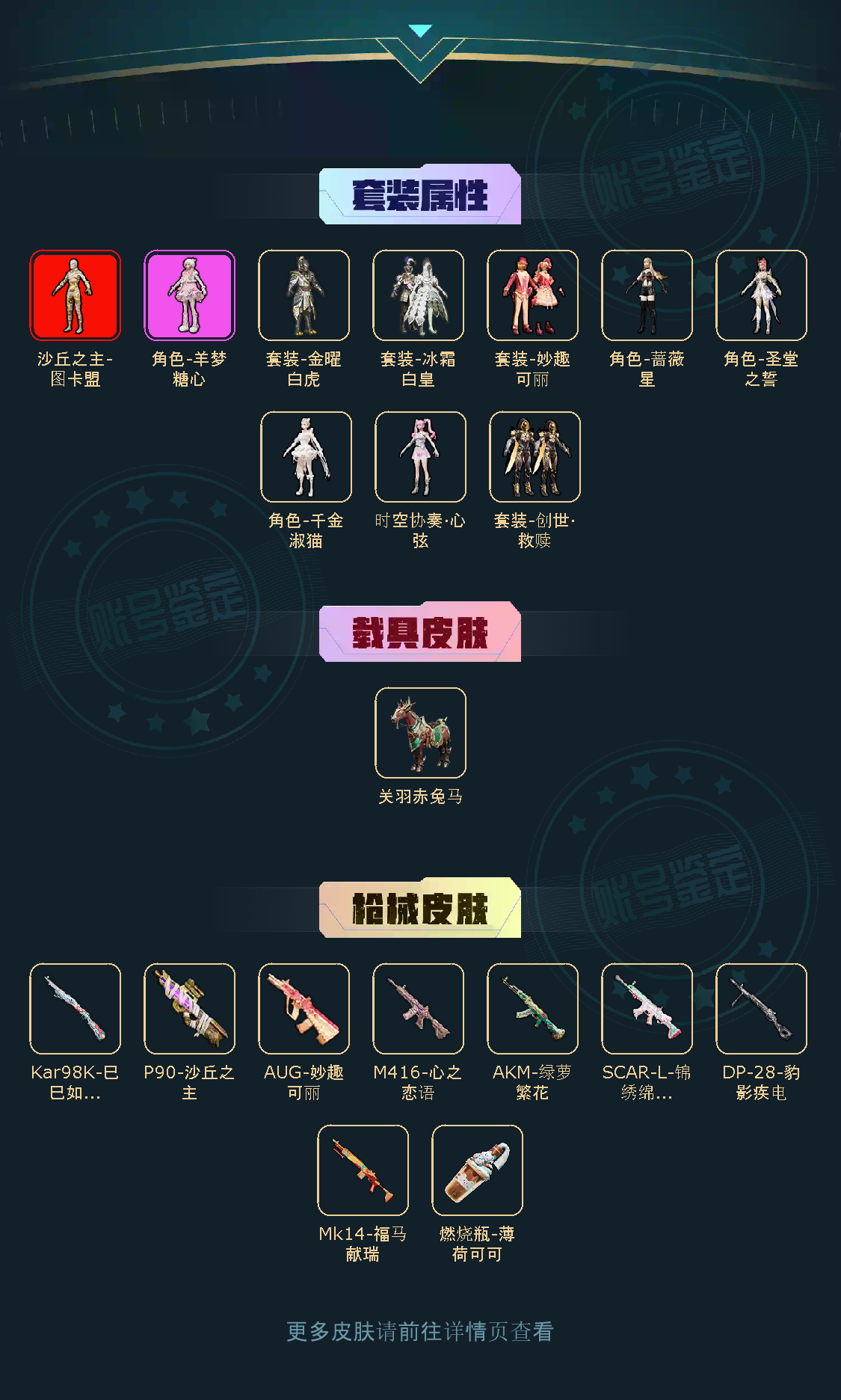 【稀有资产】沙丘之主-图卡盟[3级]/角色-千金淑猫/角色-羊梦糖心/AUG-妙趣可丽/M416-心之恋语/角色-8号机/角色-Mark.06/熔岩游骑兵面罩/套装-深海小丑鱼/套装-奇异狩猎者/套装-浪漫天命/套装-暗影哥特/套装-龟仙人/套装-迅捷狂鲨/套装-星河浪客/套装-红红火火/套装-花面小丑/套装-狂沙舞者/套装-狂战萌兔/套装-浪漫假日/套装-沙丘之歌/套装-冷酷挑战者/玩偶服-卖崽青蛙/角色-许七安/角色-情公主/撬棍-龙胆亮银枪