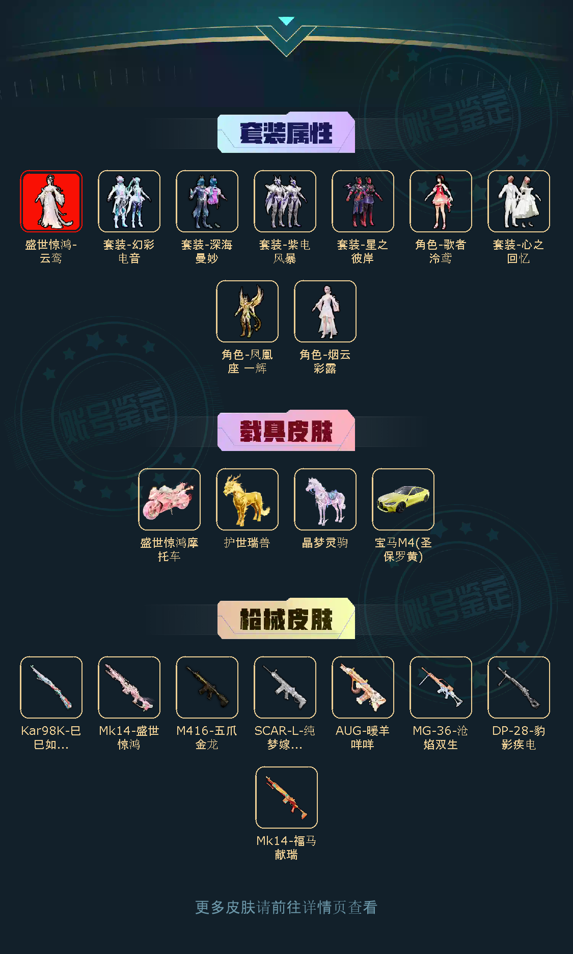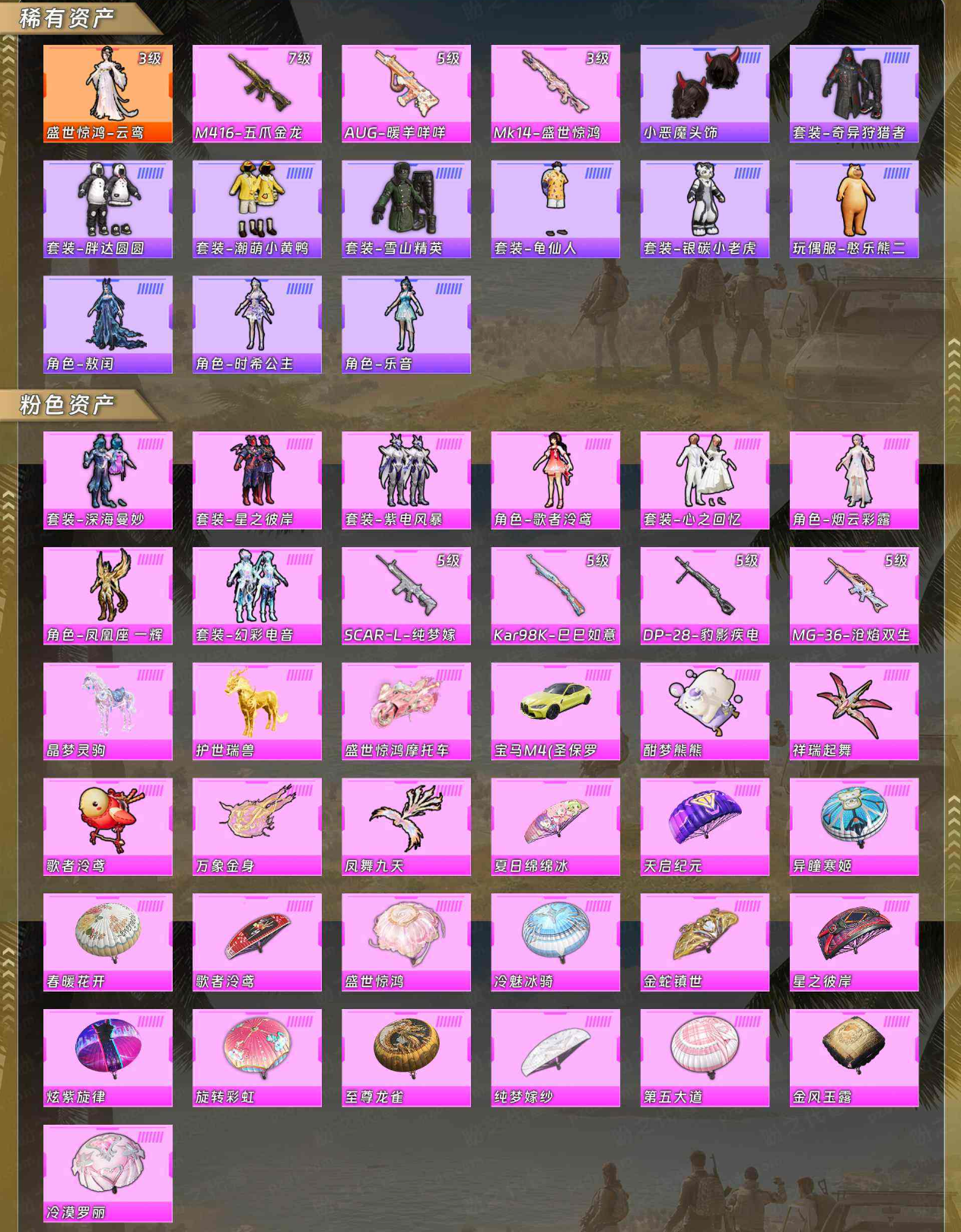 【稀有资产】盛世惊鸿-云鸾[3级]/M416-五爪金龙/AUG-暖羊咩咩/Mk14-盛世惊鸿/小恶魔头饰/套装-奇异狩猎者/套装-胖达圆圆/套装-潮萌小黄鸭/套装-雪山精英/套装-龟仙人/套装-银碳小老虎/玩偶服-憨乐熊二/角色-敖闰/角色-时希公主/角色-乐音