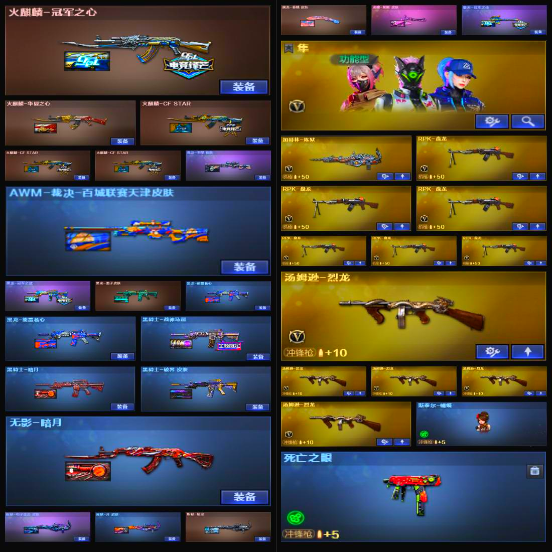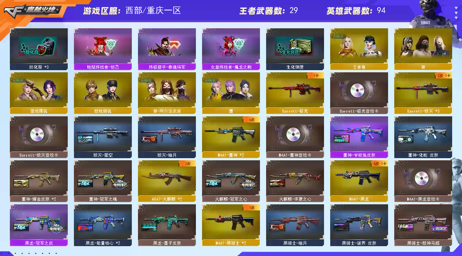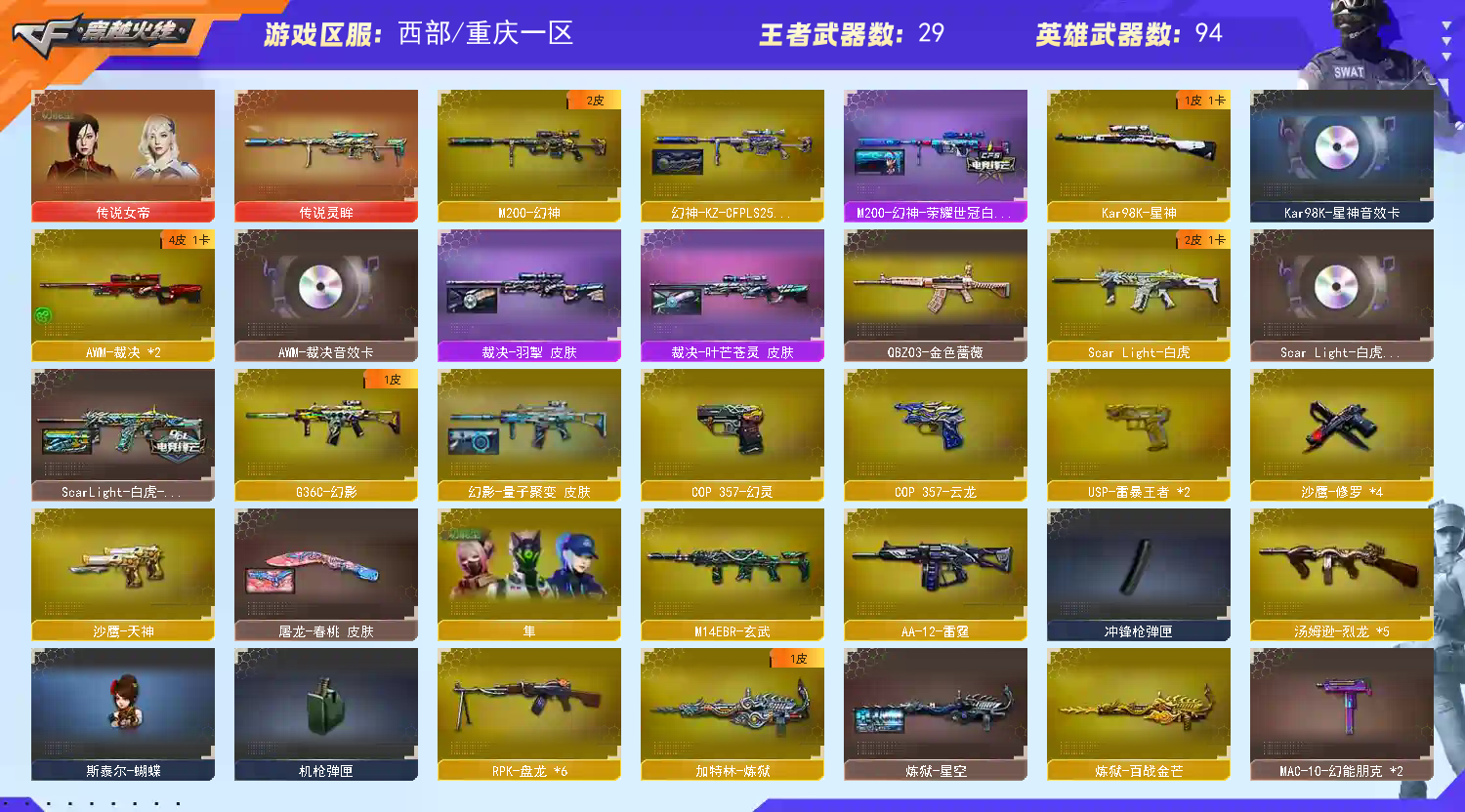【重庆一区】【幻神1皮】【裁决三件套】【死亡之眼】【斯泰尔-蝴蝶】【6盘龙】【堕天神套装X1套】【堕天神套装X1套】【雷暴套装X1套】【竞技荣光套装X1套】【传说女帝】【传说灵眸】【M200-幻神】【M200-幻神-荣耀世冠白鲨】【Kar98K-星神】【Kar98K-星神音效卡】【AWM-裁决】【AWM-裁决音效卡】【裁决-叶芒苍灵 皮肤】【裁决-羽掣 皮肤】【AWM-裁决-百城联赛天津皮肤】【G36C-幻影】【幻影-量子聚变皮肤】【Scar Light-白虎】【ScarLight-白虎-冠军之虎皮肤】【白虎音效卡】【王者凌虎】【QBZ03-金色蔷薇】【QBZ-03-王者蔷薇-觉醒版】【王者芳薇-觉醒版】【M4A1-雷霆王者-觉醒版】【M4A1-青龙】【M14EBR-玄武】【M4A1-幻灵】【USP-雷暴王者】【COP 357-幻灵】【COP 357-云龙】【丛林匕首-玄豹】【黄金猫猫手套-白鲨】【加特林-炼狱】【RPK-盘龙】【炼狱-百战金芒】【汤姆逊-烈龙】【斯泰尔-蝴蝶】【死亡之眼】【传说女帝】【葵】【奇洋探员】【蛇隐宗】【王者春】【鹰】【隼】【M4A1-雷神】【雷神-冠军之魄】【雷神-宇航兔皮肤】【雷神-耀金皮肤】【雷神-化蛇 皮肤】【雷神-源计划2.0专属 皮肤】【M4A1-雷神音效卡】【AK47-火麒麟】【火麒麟-冠军之心】【火麒麟-华夏之心】【火麒麟-CFSTAR】【M4A1-黑骑士】【黑骑士-战神马超】【黑骑士-暗月】【黑骑士-破界 皮肤】【M4A1-黑龙】【黑龙-冠军之武】【黑龙-墨子皮肤】【黑龙-能量核心】【M4A1-黑龙音效卡】【Barrett-毁灭】【毁灭-星空】【毁灭-百城浙江 皮肤】【毁灭-暗月】【毁灭-虹光风暴 皮肤】【Barrett-毁灭音效卡】