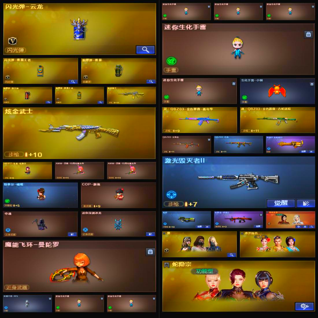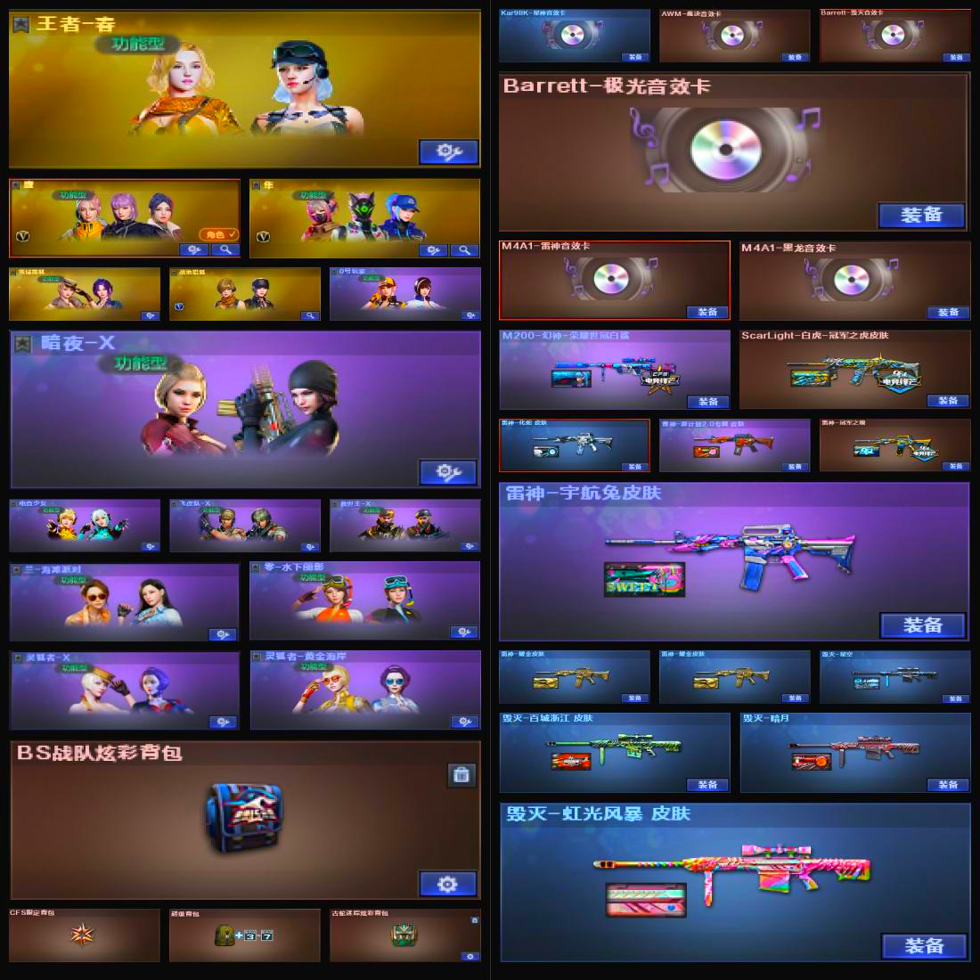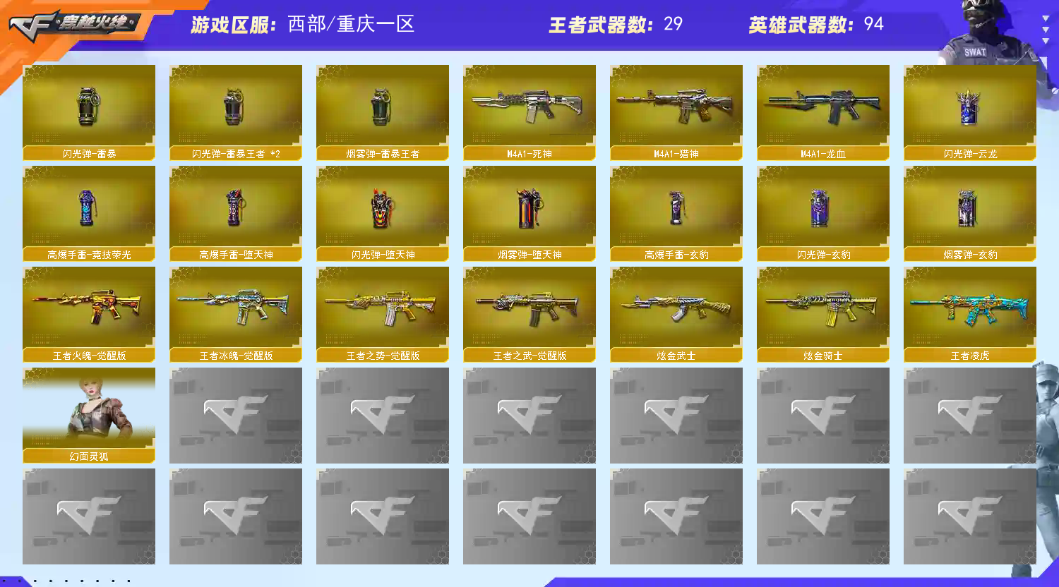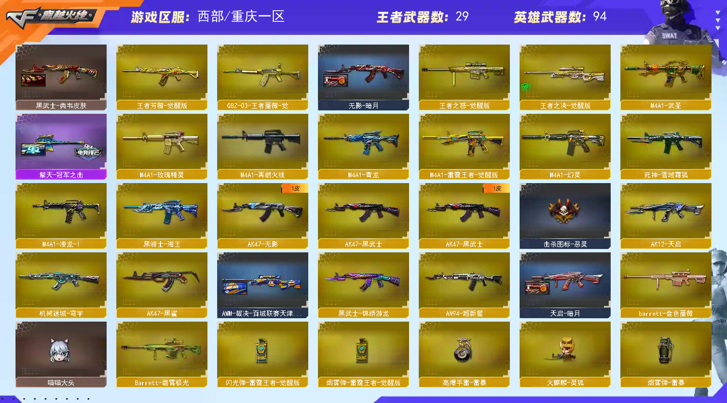 【重庆一区】【幻神1皮】【裁决三件套】【死亡之眼】【斯泰尔-蝴蝶】【6盘龙】【堕天神套装X1套】【堕天神套装X1套】【雷暴套装X1套】【竞技荣光套装X1套】【传说女帝】【传说灵眸】【M200-幻神】【M200-幻神-荣耀世冠白鲨】【Kar98K-星神】【Kar98K-星神音效卡】【AWM-裁决】【AWM-裁决音效卡】【裁决-叶芒苍灵 皮肤】【裁决-羽掣 皮肤】【AWM-裁决-百城联赛天津皮肤】【G36C-幻影】【幻影-量子聚变皮肤】【Scar Light-白虎】【ScarLight-白虎-冠军之虎皮肤】【白虎音效卡】【王者凌虎】【QBZ03-金色蔷薇】【QBZ-03-王者蔷薇-觉醒版】【王者芳薇-觉醒版】【M4A1-雷霆王者-觉醒版】【M4A1-青龙】【M14EBR-玄武】【M4A1-幻灵】【USP-雷暴王者】【COP 357-幻灵】【COP 357-云龙】【丛林匕首-玄豹】【黄金猫猫手套-白鲨】【加特林-炼狱】【RPK-盘龙】【炼狱-百战金芒】【汤姆逊-烈龙】【斯泰尔-蝴蝶】【死亡之眼】【传说女帝】【葵】【奇洋探员】【蛇隐宗】【王者春】【鹰】【隼】【M4A1-雷神】【雷神-冠军之魄】【雷神-宇航兔皮肤】【雷神-耀金皮肤】【雷神-化蛇 皮肤】【雷神-源计划2.0专属 皮肤】【M4A1-雷神音效卡】【AK47-火麒麟】【火麒麟-冠军之心】【火麒麟-华夏之心】【火麒麟-CFSTAR】【M4A1-黑骑士】【黑骑士-战神马超】【黑骑士-暗月】【黑骑士-破界 皮肤】【M4A1-黑龙】【黑龙-冠军之武】【黑龙-墨子皮肤】【黑龙-能量核心】【M4A1-黑龙音效卡】【Barrett-毁灭】【毁灭-星空】【毁灭-百城浙江 皮肤】【毁灭-暗月】【毁灭-虹光风暴 皮肤】【Barrett-毁灭音效卡】