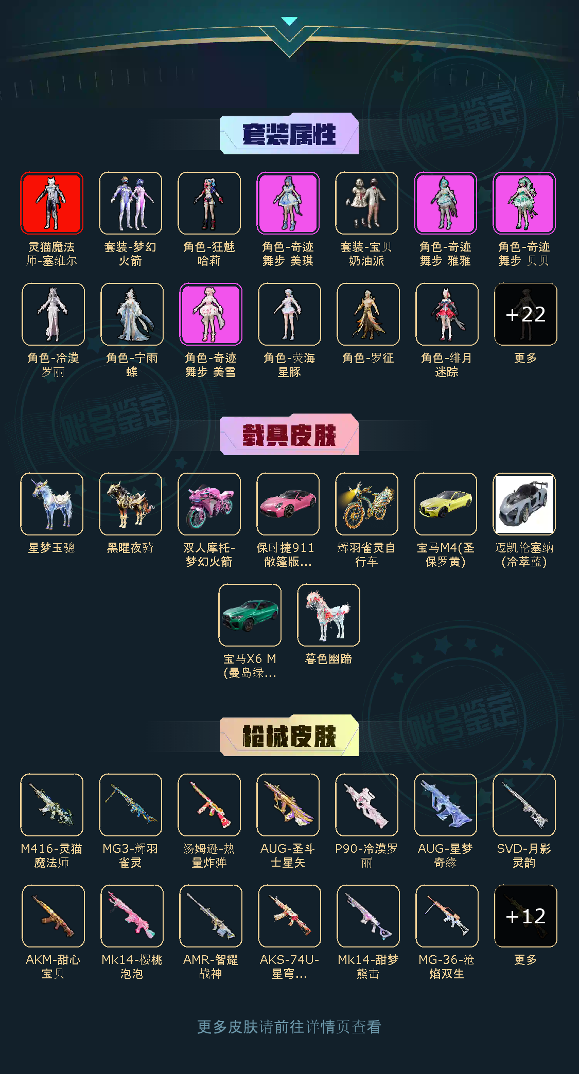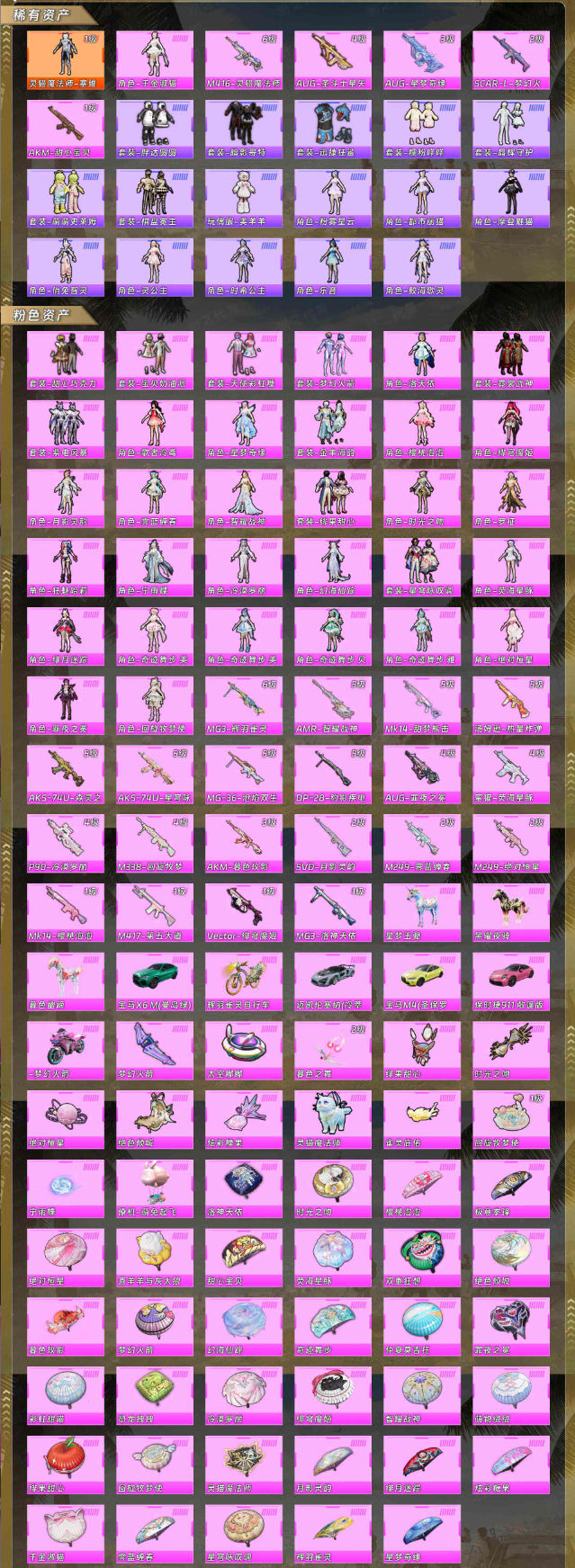 【稀有资产】灵猫魔法师-塞维尔[1级]/角色-千金淑猫/M416-灵猫魔法师/AUG-圣斗士星矢/AUG-星梦奇缘/SCAR-L-梦幻火箭/AKM-甜心宝贝/套装-胖达圆圆/套装-暗影哥特/套装-迅捷狂鲨/套装-糯粉咩咩/套装-晶辉守护/套装-萌萌史莱姆/套装-棋盘冕主/玩偶服-美羊羊/角色-粉雾星云/角色-都市丽猫/角色-摩登魅猫/角色-俏兔智灵/角色-灵公主/角色-时希公主/角色-乐音/角色-鲛海歌灵