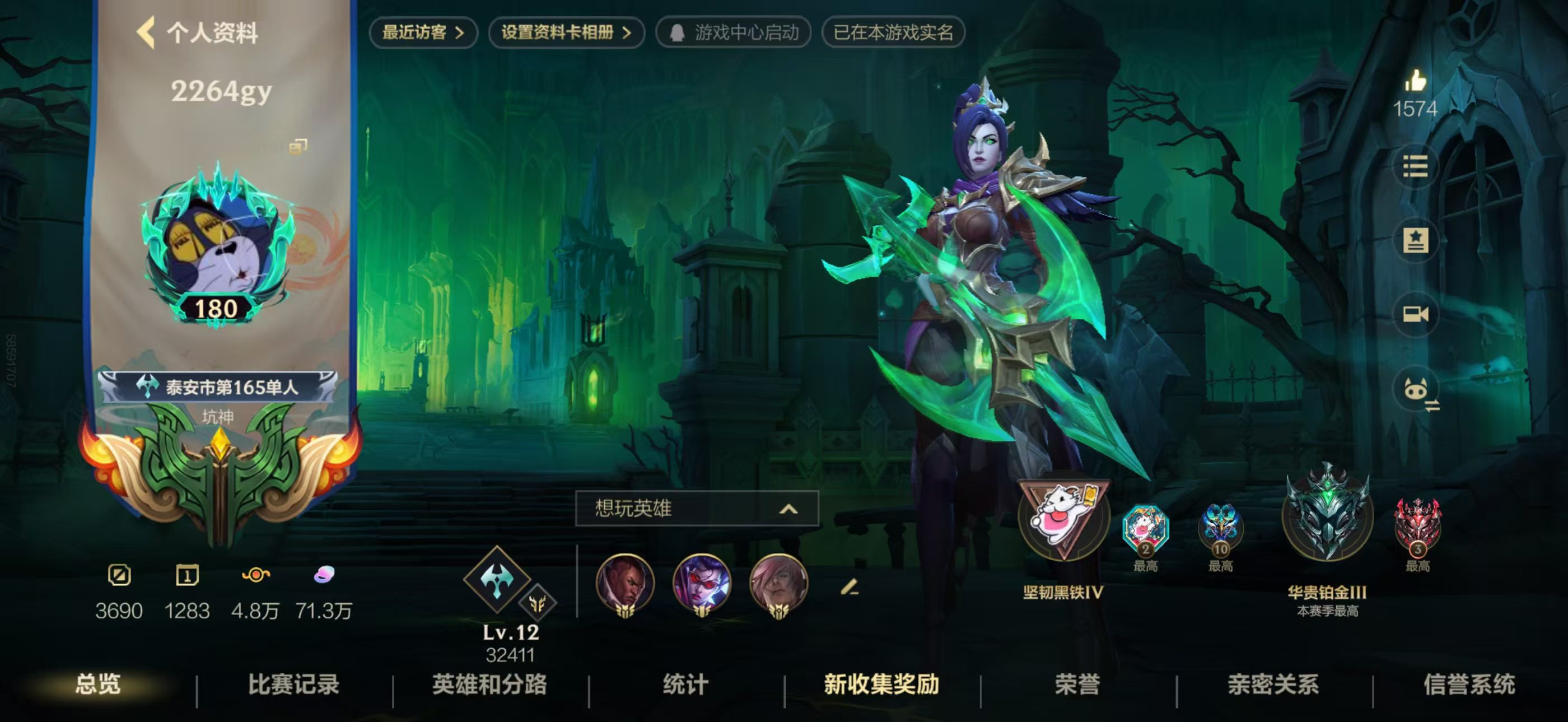 【苹果】 英雄数量 131 皮肤数量 260 排位段位 华贵铂金 参加排位赛 允许