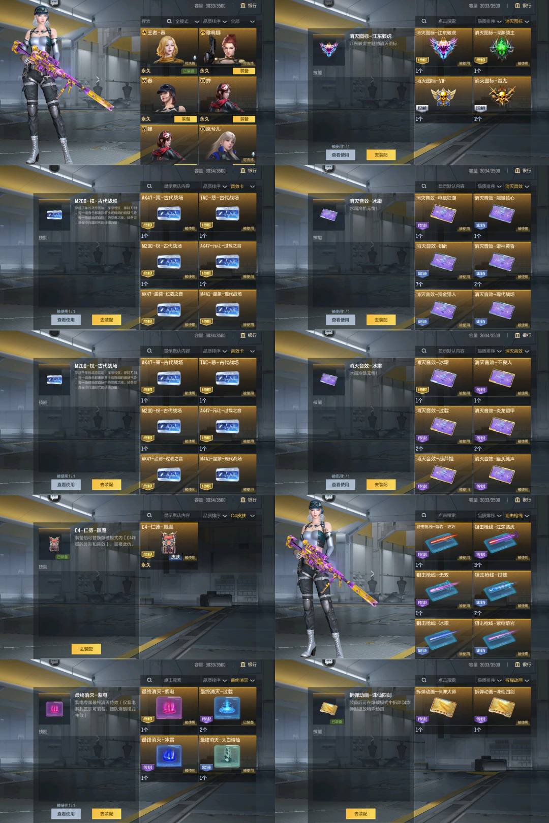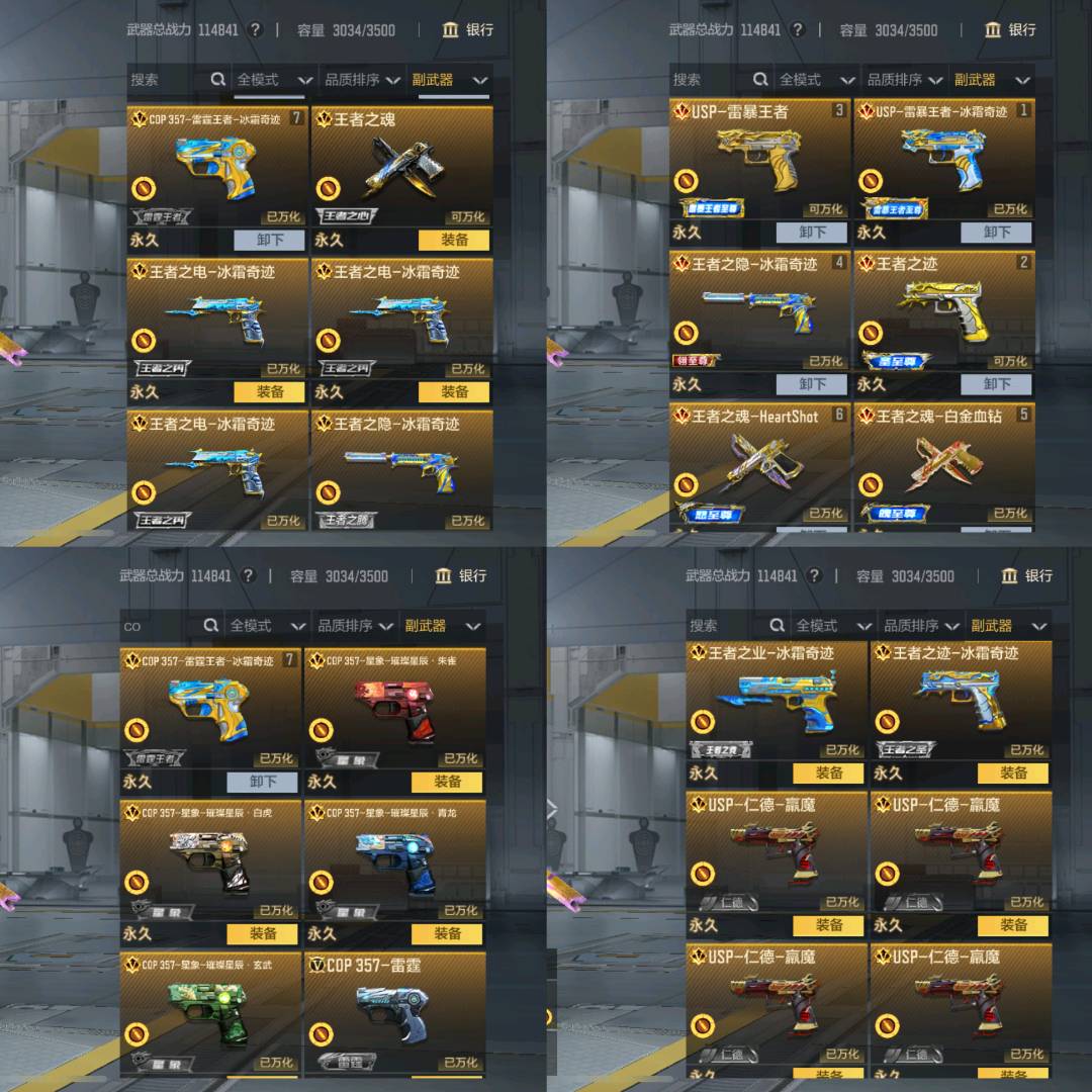 GLOCK18-本初,武器-双持尼泊尔。变色龙,武器-双持斯奉尔-天使*2,武器-双持沙鹰-元让,武嚣-双持沙鹰-变色龙,武器-双管猫枪 -未来战士,武器。双管猎枪。极光盾,武器。唐刀。华夏传说,武器。唐刀。大唐荣耀,武器-晴矢,武器。地狱烈樱二觉,武器-地狱烈炎,武器-墨刃。幻神,武器-太白诗仙扇,武器-女皇利刃-铁胆虎钱*3,武器。碎魂刀,武器。寒霜烈龙*2。武器-尼泊尔。冰觉醒,武器。尼泊不象*3,武器-尼泊尔-机械纪元*2,武器-尼泊尔-雷霆*2,武器-武器-左轮。卧龙觉醒,武器。左轮。竟界荣光,武器-左轮。黑武士,武器左轮-黑武士觉醒,武器。巨龙的哮叫,武器-巴雷特-冬灭觉醒,武器-巴