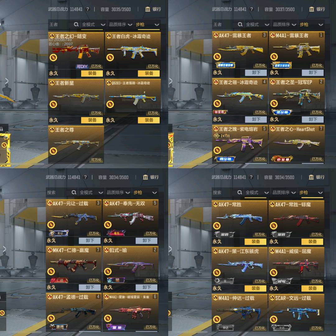 [武器]武器。王者之幻,武器-M4A1-墨暴王者,武器-王者之尊,武器-王者白虎,试器。王者星神,试器-王者新星,试器-王者之盘,试器王者之技,武器-QBZ03-王者蔷薇,武器-M12S-雷霞王者,武器-王者之翎,武器。王者之魏,武器。王者之影,武器。王者之心*3,武器。王者之腾,武器-王者之圣*2,武器-王者之势,武器-王者之力,武器-王者之怒,武器-王者幻神,武器-王者之棒,武器-王者之烈*6,武器。王者之狱,武器-王者之业,武器-王者之迫*2,武器-USP-雷暴王者*2,武器-王者之电*3,武器-王者之魂*3。武器-王者之隐*2,武器-王者之击,武器。王者之刺,武器。王者之痕,武器。王者之仞,武器。王者之锋*5。武器-AN94-盖,武器-CZS2-仲康,武器-M200-权,武器-KSG-孟获*2,武器-AK47-策,武器-AK47-元让,武器-SKS-曳鼎,武器-81式。瑜武器-AK47-奉先,武器-AK47-孟德,武器-M4A1-幻灵,武器-M4A1-九尾狐,武器-M4A1-仲达,武器-M4A1-星象,武器-M4A1-游骑兵,武器-MK47-仁德,武器-MK47-机械紀元,武器-AWM-妙才*4,武器 M200-幻神,武器-TAC-慈,武器-GM6-逆骨,武器-VEPR12-审斯,武器-巴雷特-定军,武器-巴雷特-雷神,沈器-SCAR-文远,武器-M12S.天公,武器-双持CZS2-魔礼寿,武器-81式-光明之神,武器-81式-机械纪元。武器-MK47-云舞。武器-COP357-堕天神*2。武器-COP357星象*4,武器-COP357-雷霆,武器柯尔特仲达*2,武器-MK23-幻神*3,武器-MK23-机械纪元,武器-MK23-瑜,武器-双管猎枪-文远,武器-双管猫枪-哈迪斯*2,武器-炽芒蝶刃,武器-09式猫-天神,武器-09式。魔音长歌觉醒,武器-98K-星神,武器-98K-血月,武器-98K。黑骑士,武器-9A91-天神,武器-9A91-死,武器-9A91-游骑兵,武器-9A91-诛仙四剑,武器-9A91-魔蜥觉醒*2,武器-A180-地狱,凰,武器-AA12-火药觉醒,武器-AA12-竞界荣光,武器-AK12-天启*2。武器-AK47-华夏传说2,武器-AK47-变色龙武器-AK47-塔罗月不武器-AK47-天使,武器-AK47-常胜*2,试器-AK47-幸运日,武 AK47-无影,武器-AK47-星速,武器-AK47-木兰,武器-AK47-机械迷,武器。AK47-沙漠郡主。二觉武器-AK47-沙漠领主,武器AK47-游骑兵,武器-AK47-火麒麟*3,武器-AK47-猩红传说,武器-AK47-破空冰刃,武器-AK47-竞界荣光,武器-AK47-血武士*3,武器-AK47-谜城烟火*2。武器-AK47-轮回,武器-AK47-雅韵青花,武器-AK47-雷暴*2武器-AK47-雷暴王者,武器-AK47-雷麒频*2,试器-AK47-麒麟,试器- AK47-黑武士,武器-AK47-黑武士觉醒,武器-AK47-黑鲨*2,武器 AN94-卷帘大将军,武器-AN94-四觉醒,武器-AN94-赳赳秦师,武器-AN94-超新星,武器-AUG-机械纪元*3,武器-AWM-大湾溢彩,武器-AWM-天使,武器-AWM-天龙2武器-AWM-天龙。曼陀罗,武器 AWM-指南针。武器-AWM-指南针觉醒,武器-AWM-游骑兵,武器 AWM-竞界荣光,武器-AWM-裁决,武器-AWM-赛博时代,武器-Ash-马上来财,武器-Ash-马上来财(赛季强化),武器-CBJ-MS-毒蜂武器-CZ75-死神,武器-CZ75-策,武器-CZS2-心动次元觉醒,武器 CZS2-血月*2,武器-FAMAS-湮灭,武器-G36-机械紀元,武器-G36-李星云,武器-G3A3-五色琉璃觉醒,武器-G3A3-衍神兵*2,武器