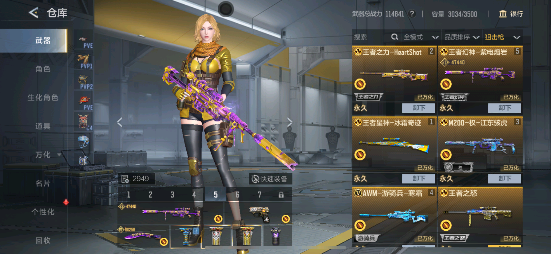 SCARLight-白虎,武器-SKS-美杜莎,武器-SR25-燃烧泰坦,武器- TAC-天使,武器-USP-仁德*5,武器-USP-仲康,武器-USP-太白诗仙武器-USP-机械迷城*2,武器-USP-神工天巧,武器-VSK-94-九黎兵主觉醒,武器-VSK-94-金蚀,武器-XM8-湮灭,武器-丛林匕首-死神,武器-丛林匕首-火力竞放,武器-亡命之徒-鬼魅双生,武器-修罗之刃武器-公瑾佩剑,武器-刘易斯-天使,武器-刘易斯-血月,武器-剑齿虎炫彩,武器-加特林。堡垒*2,武器-加特林-堡垒觉醒,武器-加特林-星际战舰,武器-加特林。炼狱,武器-匕首-冰魂觉醒,武器-匕首-浩瀚征途,武器-双刃-昼伏夜影觉醒,武器-双截榴。天使,武器-双持