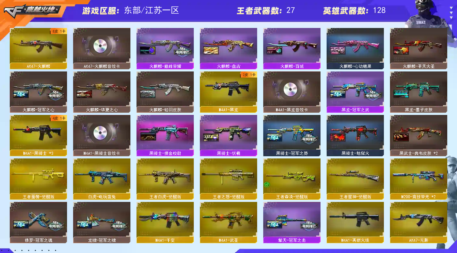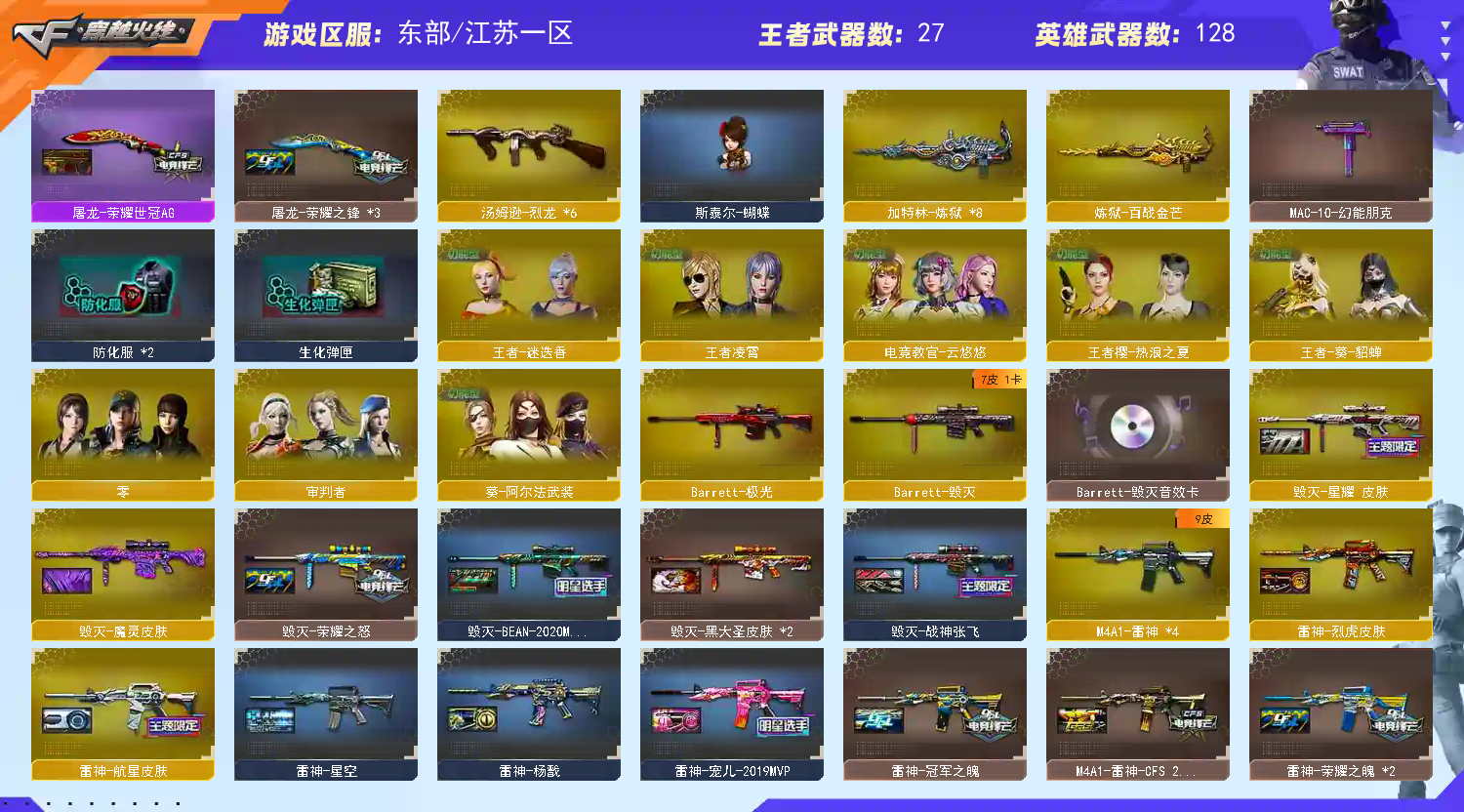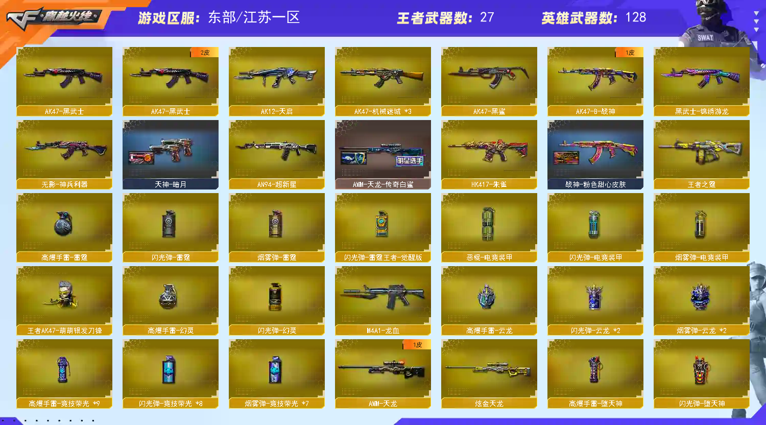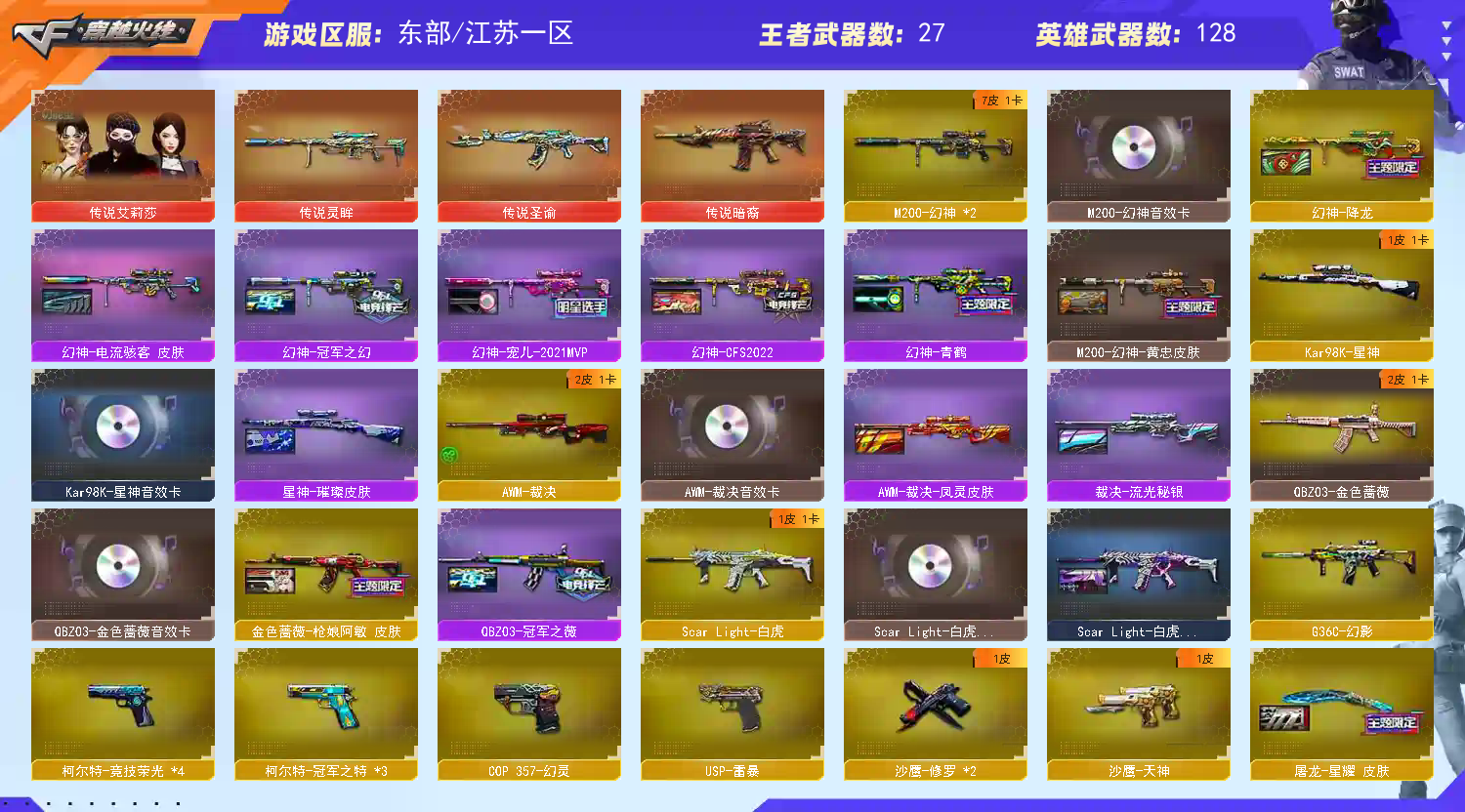 【稀有武器】:传说暗裔/传说灵眸/M200-幻神(2)/Kar98K-星神/G36C-幻影/ScarLight-白虎/HK417-朱雀/USP-雷暴/COP357-幻灵/柯尔特-竞技荣光(4)/柯尔特-冠军之特(3)/QBZ03-金色蔷薇/AK47-火麒麟/M4A1-黑龙/M4A1-雷神(4)/M4A1-黑骑士(3)/AK47-无影/AK47-黑武士/白虎-电玩蓝兔/Barrett-毁灭/Barrett-极光/AWM-裁决/M200-竞技荣光(2)/加特林-炼狱(8)/汤姆逊-烈龙(6)/麒麟刺-堕天神/尼泊尔-电竞装甲/擎天-竞技荣光(3)/云龙扇