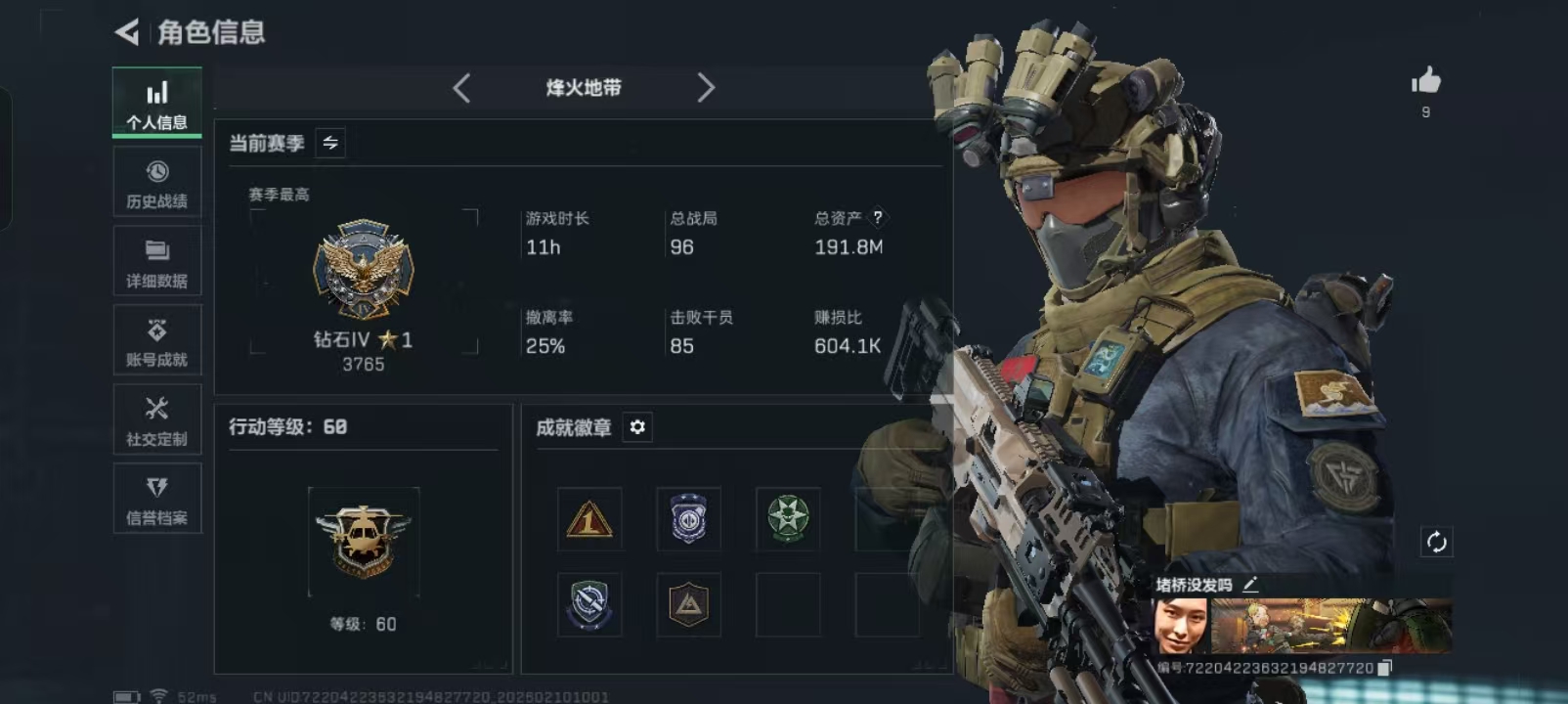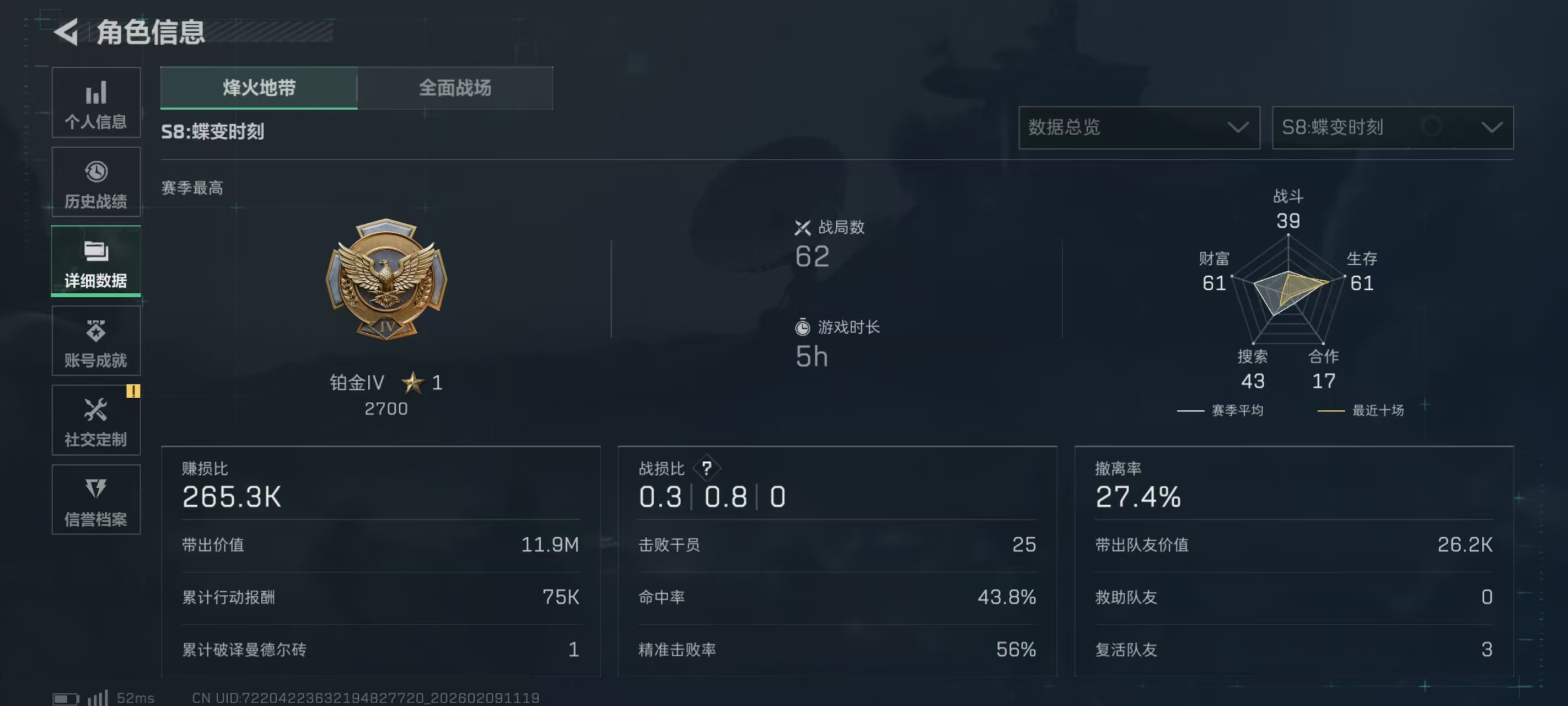 9格卡7体,赛季6格,仓库物资随便用,236枪皮,超低KD,冻结或高危点击协助可秒解除,皮肤号,60级,花不完的哈夫币系统会自动退.