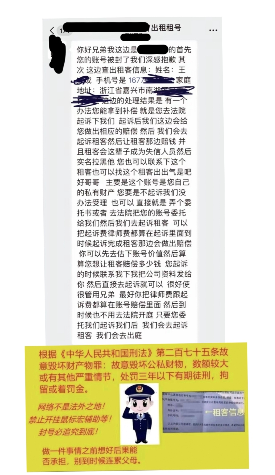 本账号已在当地公安局做了虚拟财产登记,开挂,盗号等违法行为报案处理。根据《侵权责任法》第四十九条规定,因租赁,借用等情形发生损坏,或破坏,应由使用人承担赔偿责任进行处罚。租号实名制,18岁以下请勿租用,切勿以身犯法。【租客必看】:【请勿开挂引火上身】 租赁本账号即默认同意以下协议,若不同意请勿租赁!承租方不得使用外挂、脚本或其他违规软件,如因违规导致账号封禁或损坏,需全额赔偿:账号市场估值损失(如永久封禁,按市场价值计算)。租赁期间的所有收益损失。期间所需的律师费、诉讼费、差旅费、执行费等费用。若承租方拒绝赔偿,出租方有权向法院起诉,并申请强制执行。租赁即视为接受本协议,并同意由出租方所在地法院管辖。