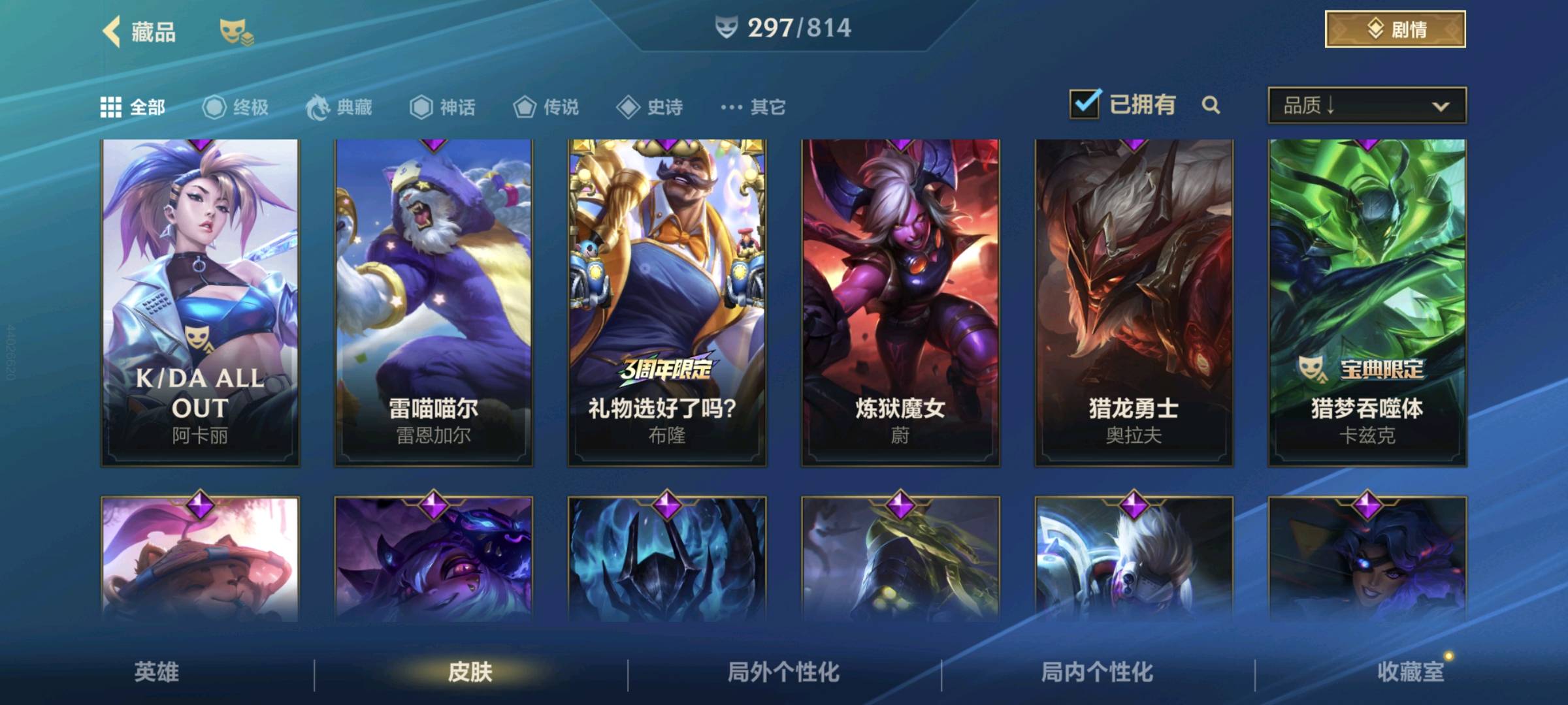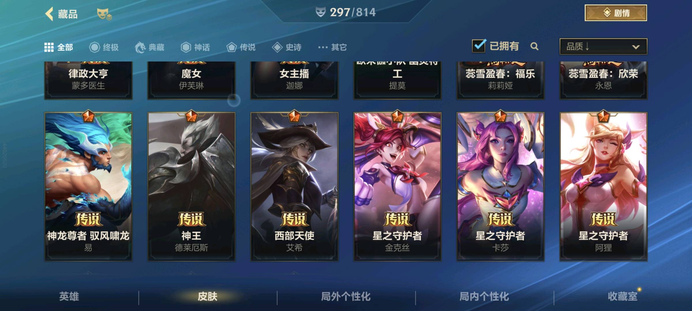 好的皮肤有马年全皮肤,神王诺手,神话金克丝小法师,神龙剑圣,星之守护者霞洛金克丝卡莎阿狸等等,租号请不要挂机谢谢