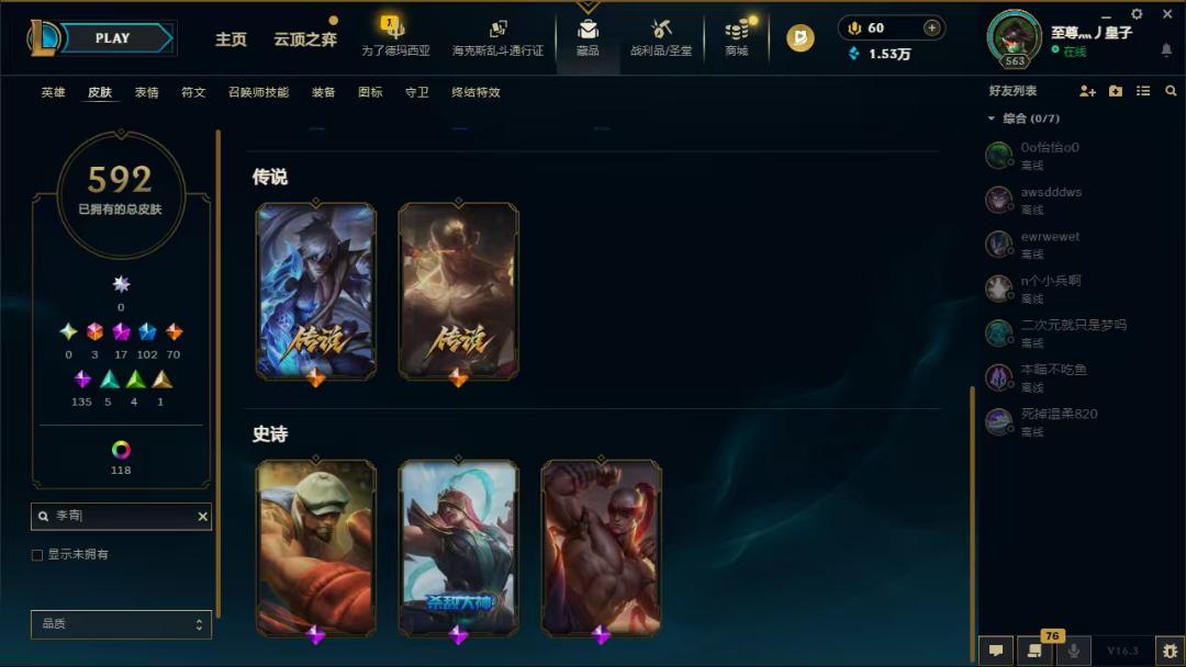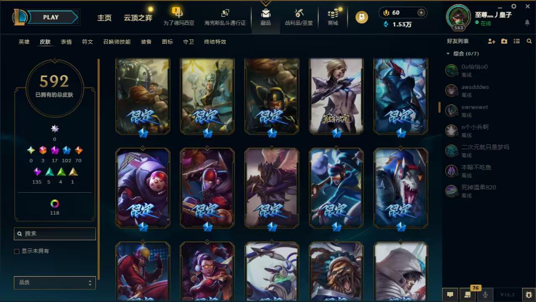 563级,德玛西亚,172全英雄,592皮肤,可排位,龙瞎,神龙李青,至臻影武者亚索,至臻灵能ez,